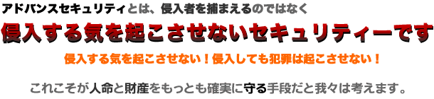 侵入盗を企てる者は、暗くて静かな所が大好きです。では、侵入しようとした時に強烈な閃光で照らされ、警報ベルがけたたましく鳴り響いたらどうでしょう?侵入者はあわてて退散するに違いありません。 侵入犯罪を未然に防ぐアドバンスセキュリティシステムは、光で威嚇、音で威嚇、遠隔音声で威嚇することにより、侵入者を撃退します。